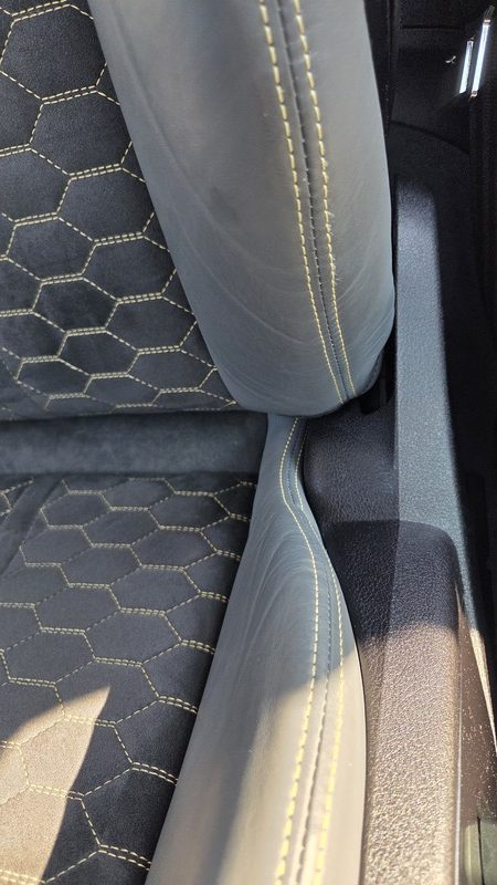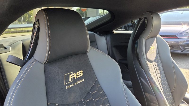Sedili Sportivi RS: Rivestiti in pelle Nappa fine grigio jet e Alcantara nera, con cuciture a contrasto in Giallo Calendula e ricamo “Iconic Edition”.